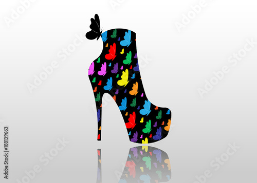 Woman Black Boots On High Heels Side View Logo Shoe Store Shop Fashion Collection Boutique Label Company Logo Design Shoes With Colorful Butterflies Print Vector Isolated Or Grey Background Buy This
